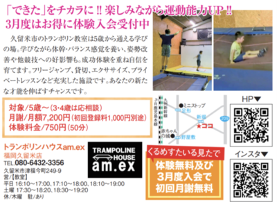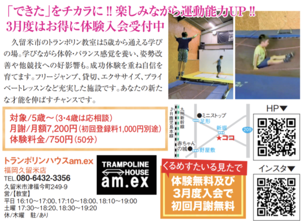 【福岡久留米店】3月度教室体験・入会お得に受付中☆『くるめすたいる』で紹介されました!! 2026.03.07 こんにちは、トランポリンハウスアメックスです!久留米市のフリーペーパーご当地新聞 くるめすたいる 3月号に福岡久留米店が紹介されました☆↑くるめすたいる3月号↑掲載内容『くるめすたいる』の掲載に合わせまして3月度はお得に体験・入会を受け付けています☆くるめすたいる見たで体験料無料および3月度入会で初回月謝無料!!※施設初めてご利用の場合は初回登録料1,000円がかかります体験のご予約はお電話もしくはメールフォームにて受け付けております教室に興味ある方!!お得なこの機会を逃さないようどうぞお早めに体験・入会をご検討ください(^^)/~~~~~~~~~~~~~~~~~~~~~~~~遊べるプランや教室、貸切などメニューがいろいろあります☆詳しくはこちらのページからご確認ください!各メニュー案内はこちら♪♪料金表はこちらからご確認ください!料金表はこちら♪♪お店までの行き方は下のリンクからチェック↓↓↓福岡大野城店はこちらから♪♪福岡新宮店はこちらから♪♪福岡久留米店はこちらから♪♪ 【福岡大野城店】定休日のお知らせ >