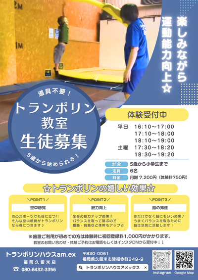 トランポリン教室生徒募集!! 2026.04.11 こんにちは、トランポリンハウスアメックスです!新年度突入!!4月は新しいことを始める季節????この機会にお子様の習い事を始めてみませんか?トランポリンハウスアメックスでは、トランポリン教室の新規生徒募集中☆トランポリン教室では楽しみながら運動能力アップが期待できます!トランポリンで培った運動能力はこれから先いろんなスポーツで活かされるので、やりたいスポーツがまだ見つかっていないお子様にこそトランポリン教室がオススメ☆トランポリンハウスアメックスは福岡県の大野城市、粕屋郡新宮町、久留米市にあるトランポリン施設!!トランポリン教室は3店舗とも開催中!!各店舗の教室スケジュールはこちらの記事をご確認ください↓↓トランポリン教室スケジュール&空き状況教室では入会前に体験もできます☆体験ご希望の方、教室についてご質問がある方はお電話かメールフォームをご活用ください♪♪~~~~~~~~~~~~~~~~~~~~~~遊べるプランや教室、貸切などメニューがいろいろあります☆詳しくはこちらのページからご確認ください!各メニュー案内はこちら♪♪料金表はこちらからご確認ください!料金表はこちら♪♪お店までの行き方は下のリンクからチェック↓↓↓福岡大野城店はこちらから♪♪福岡新宮店はこちらから♪♪福岡久留米店はこちらから♪♪ 【春休みイベント】出張トランポリン開催!! >